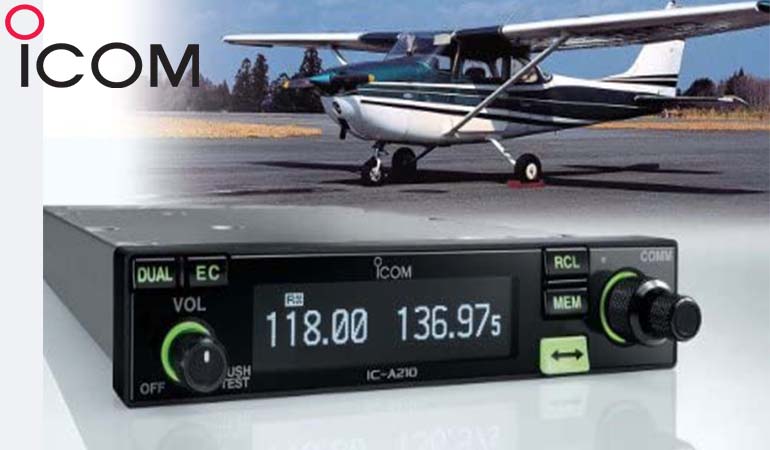 Le convertisseur CC-CC intégré accepte une source d'alimentation CC 12/24 V (11,5–27,5 V). L'IC-A210 s'installe facilement dans la plupart des avions ou des véhicules